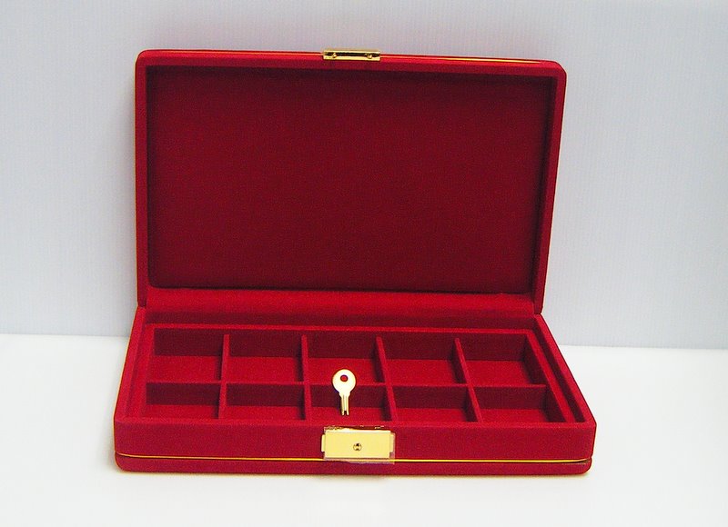 กล่องใส่พระแบบ 10ช่อง(รุ่นใหม่เอี่ยม) หุ้มกำมะหยี่สีแดง สวยหรู ใส่พระพร้อมกล่องพระประกวดได้เลยคะ พร้อมสามารถเก็บใส่เซฟธนาคารได้คะ มือ1ใหม่เอี่ยม นะคะ