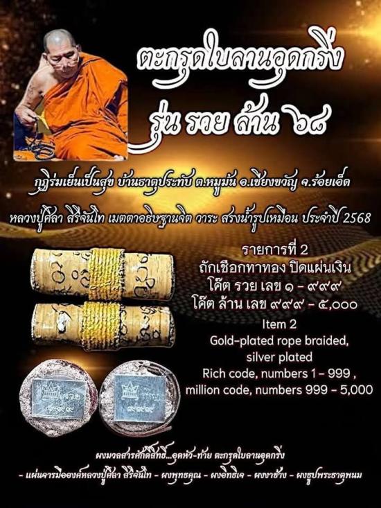 หลวงปู่ศิลา รุ่นรวยล้าน68 ตะกรุดใบลานอุดกริ่ง ถักเชือกทาทอง ปิดแผ่นเงิน ซีลเดิมลุ้นเลขสวย |