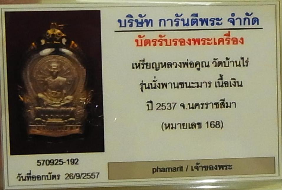หลวงพ่อคูณ นั่งพานชนะมาร เนื้อเงิน สวยใส จมูกโด่ง หมายเลขมงคล 168