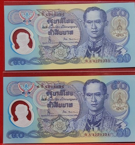 ธนบัตรที่ระลึก 50 บาท งานฉลองครองราชครบ 50ปี ของในหลวงร.9 เลขเรียงกัน จำนวน 2ฉบับ สภาพใหม่ UNC หมายเลข 9A 4229324 และ 9A 4229325 ลายเซ็น บดี - เริงชัย |
