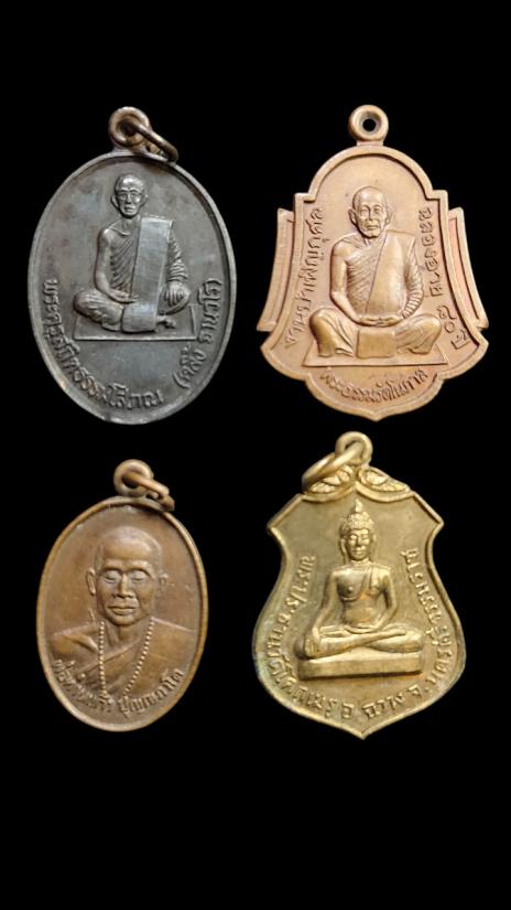 **100.** (4เหรียญ)1เหรียญพระประธานวัดโคกเมรุ อ.ฉวาง ปี2517+1เหรียญพ่อท่านแก้ว วัดเขาปูน นครศรีฯ ปี2529+1เหรียญพระธรรมรัตโนภาส วัดพระมหาธาตุวรมหาวิหาร นครศรีฯ ปี2537+1เหรียญพระครูสถิตธรรมโสภณ(คลิ้ง ฐานวโร)ปี 2521 อาจารย์นำสร้างถวาย**