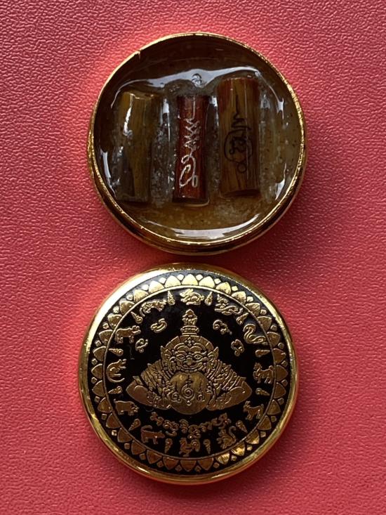 เคาะเดียวแดง สีผึ้งพระราหู รุ่น มงคลจักรวาล เนื้อ โลหะชุบทองลงยาสีดำขอบสีดำ ขนาด3.2ซม |