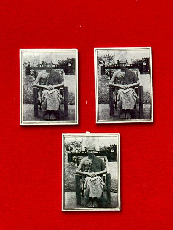 รูปถ่ายอัศวินขาปิ่นโต หลวงพ่อเกษม เขมโก จังหวัดลำปาง หลังอลูมิเนียม ด้านบนตอกโค๊ต โชคดี (1กระดาน 3 รูป) |
