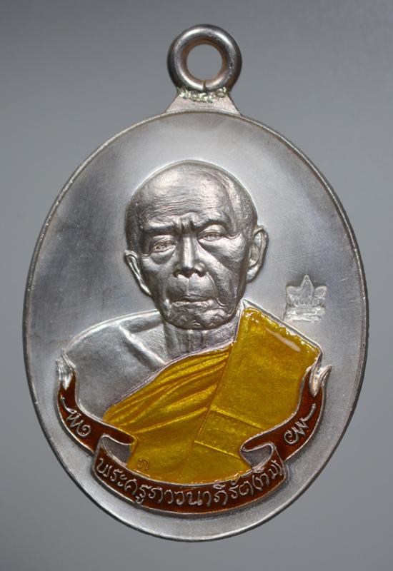 เหรียญห่วงเขื่อมหลวงปู่ทิม เนื้อเงินลงยาแดงจีวรเหลือง ปี 2558 พร้อมกล่องเดิมๆ หมายเลข 425 จำนวนการสร้าง 1,111 เหรียญ