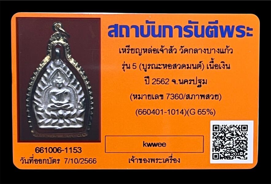 เหรียญหล่อเจ้าสัววัดกลางบางแก้ว รุ่น 5 ปี 2562 เนื้อเงิน เลี่ยมทอง พร้อมบัตรสภาพสวย