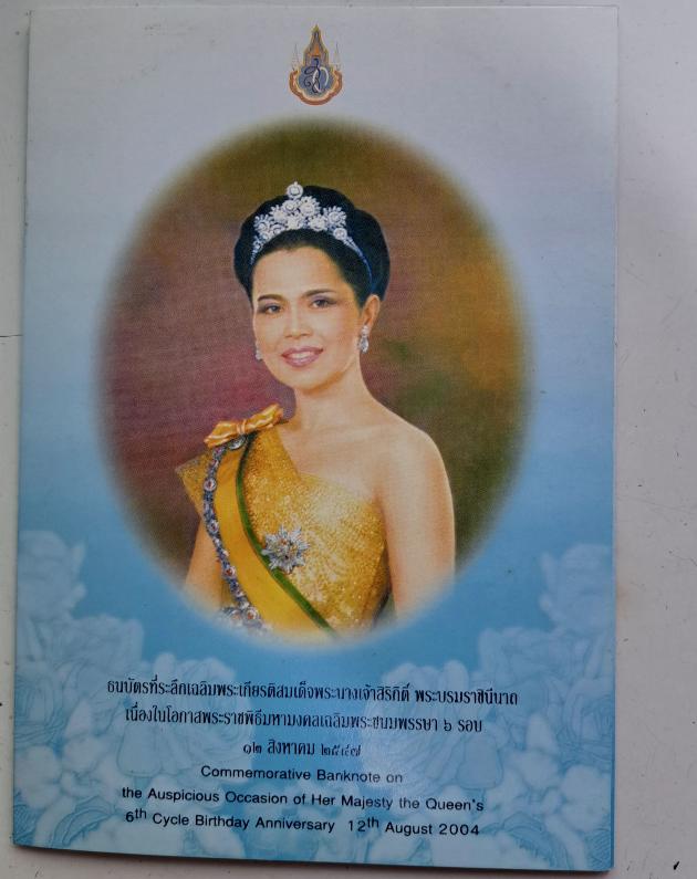 ธนบัตรที่ระลึกเฉลิมพระเกียรติสมเด็จพระนางเจ้าสิริกิติ์ พรรษา 6 รอบ (พร้อมแผ่นปก ครบชุด)จำนวนธนบัตร 4 ใบ แผ่นปก 4 ใบ |