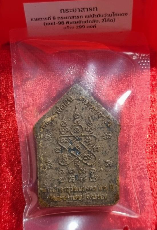 - รก.8 กระยาสารท แช่น้ำมันว่านไก่แดง (เลข 289 เลขสวยๆ เป็นกลุ่มเลขที่ให้พลังงานความมั่นคง เสริมมิตรภาพที่ดี ไม่โดนหักหลังหรือหลอกลวง คนในบ้านหรือผู้ใช้จะได้รับความเมตตาจากผู้ใหญ่ มีเหตุผล เจรจาดี และเหมาะกับการทำงานที่ต้องอาศัยการวางแผนหรือวิเคราะห์) พร้อมกล่อง