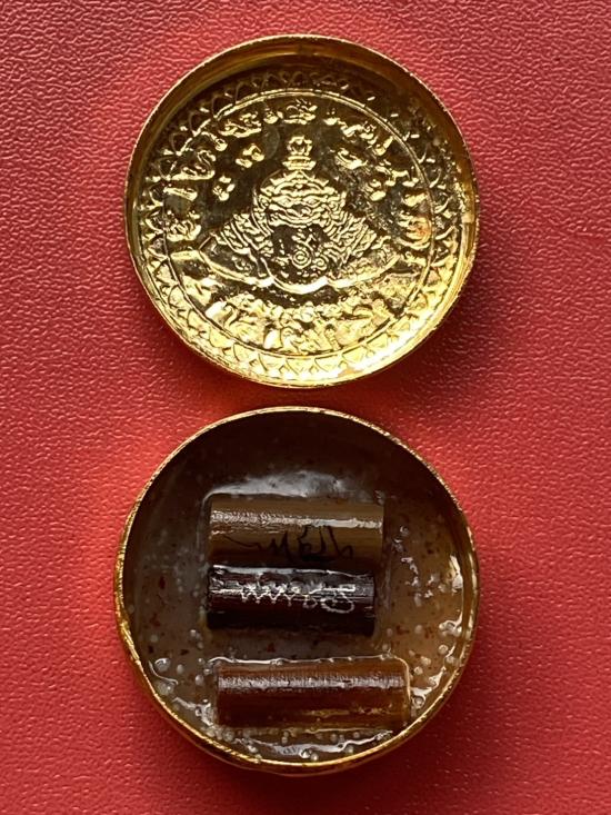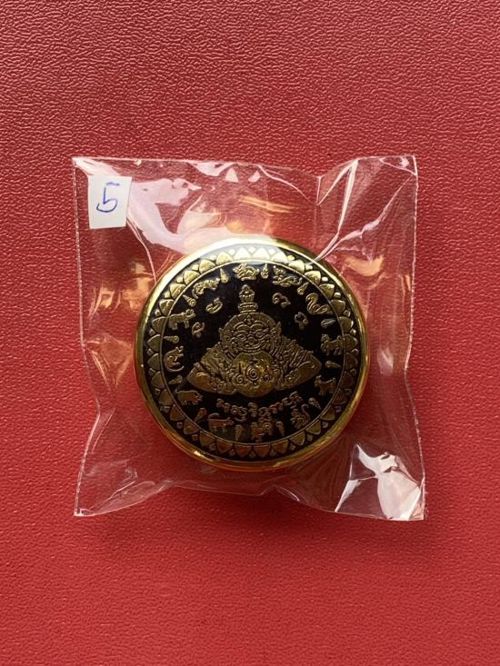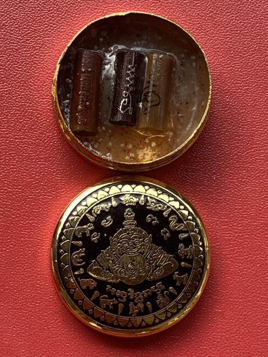 เคาะเดียวแดง สีผึ้งพระราหู รุ่น มงคลจักรวาล เนื้อ โลหะชุบทองลงยาสีดำขอบสีดำ ขนาด3.2ซม |