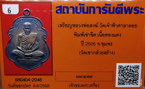 เหรียญรุ่นแรก หลวงพ่อสงฆ์ วัดเจ้าฟ้าศาลาลอย พิมพ์เข่าขีด เนื้อทองแดง ปี2505 จ.ชุมพร(วัดเขากล้วยสร้าง)+ บัตรG-pra สภาพเดิมค่ะ สภาพตามรูปทุกประการค่ะ |