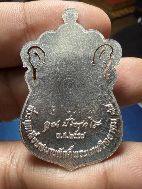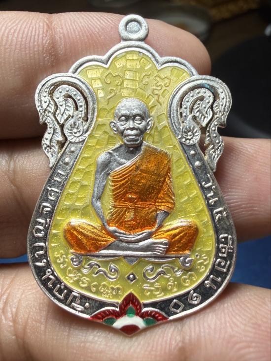 เหรียญเสมาที่รฤกเลื่อนสมณศักดิ์ 57 ออกวัดบ้านไร่ ปี 57 เนื้อลงยาเหลือง เงินหลังเรียบ ฉลุมือ หมายเลข ๙๗ สภาพสวย เคาะเดียวแดง