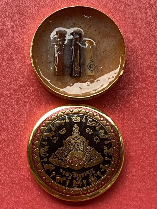 เคาะเดียวแดง สีผึ้งพระราหู รุ่น มงคลจักรวาล เนื้อ โลหะชุบทองลงยาสีดำขอบสีแดง ขนาด 5ซม |