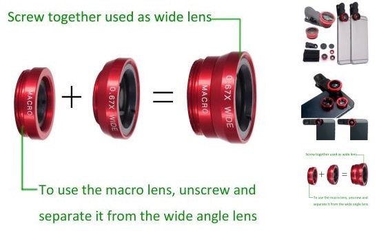 ประกอบด้วย ตัวเลนส์ 3 ชิ้น คลิปหนีบและฝาปิดเลนส์ พร้อมถุงผ้า ภายในกล่อง |