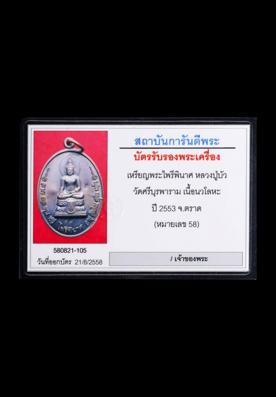 เหรียญไพรีพินาศชินบัญชร ญสส.เพชรกลับ เนื้อนวะโลหะหมายเลข 58 พร้อมบัตร พระครูสังฆกิจบูรพา(หลวงปู่บัว ถามโก) วัดศรีบุรพาราม(เกาะตะเคียน) จ.ตราด