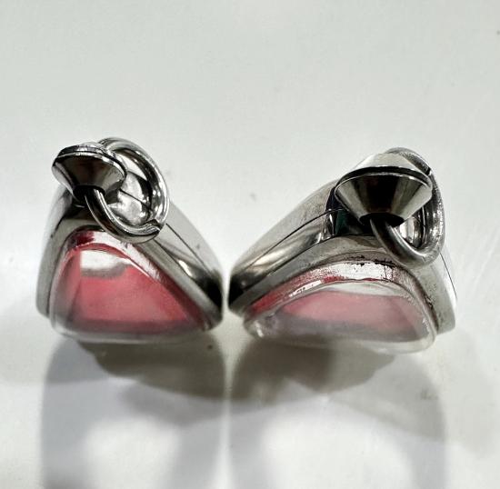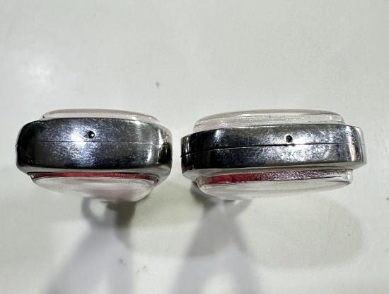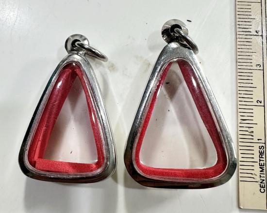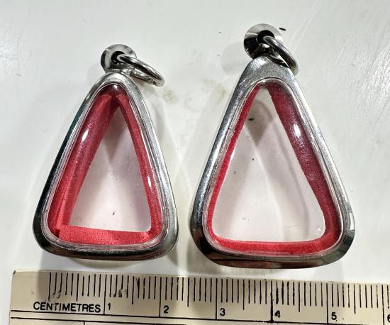ตลับมือสองสแตนเลสทรงสามเหลี่ยมใส่เหรียญหลวงพ่อเงินปี 15 ได้ 2 ใบแบบเปิดหน้า-หลังขนาด 3 x 2 ซม. |