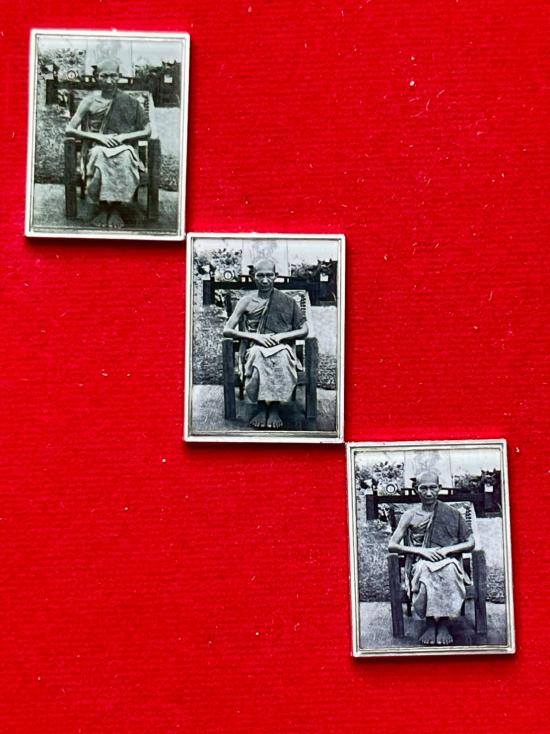รูปถ่ายอัศวินขาปิ่นโต หลวงพ่อเกษม เขมโก จังหวัดลำปาง หลังอลูมิเนียม ด้านบนตอกโค๊ต โชคดี (1กระดาน 3 รูป) |