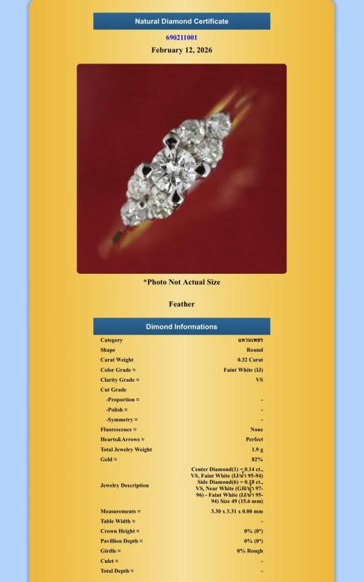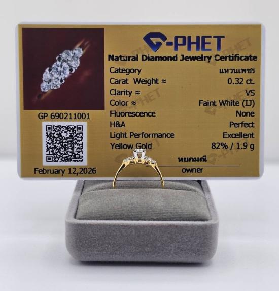 แหวนเพชรแท้ 0.32 Ct. เบอร์ 49 ตัวเรือนทอง น้ำหนัก 1.9 กรัม 82% **พร้อมบัตรรับรองจีเพชร** |