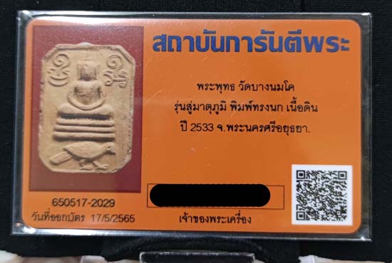 หลวงพ่อปาน วัดบางนมโค พิมพ์ทรงนก รุ่นสู่มาตุภูมิ เนื้อดินอุดผง ปี2533 พร้อมบัตรการันตีพระ พระแท้ดูง่าย |