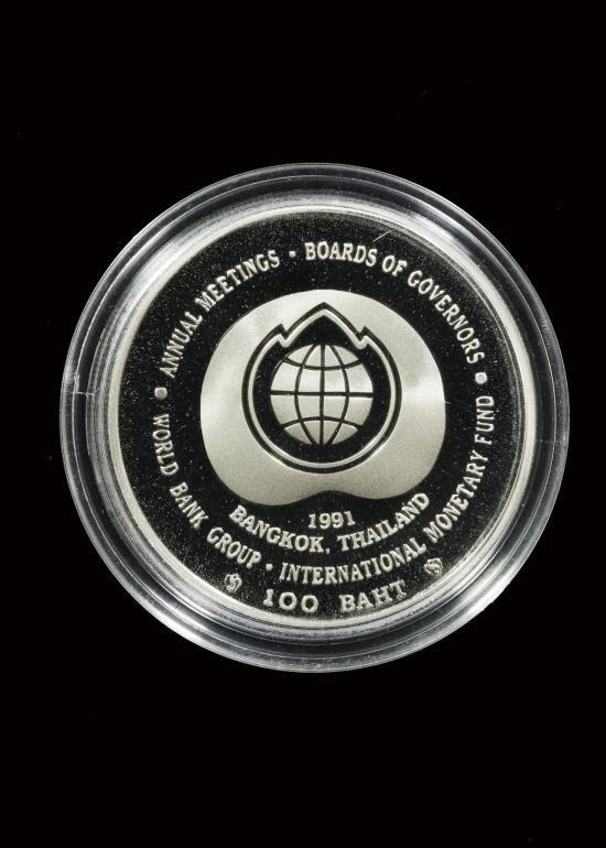 เหรียญกษาปณ์ชนิดราคา 100 บาท ร.9-ราชินี ที่ระลึกการประชุมสภาผู้ว่าการธนาคารโลก WORLD BANK ปี2534 ((( นิกเกิล ขัดเงา ))) มีใบ เก่าเก็บ