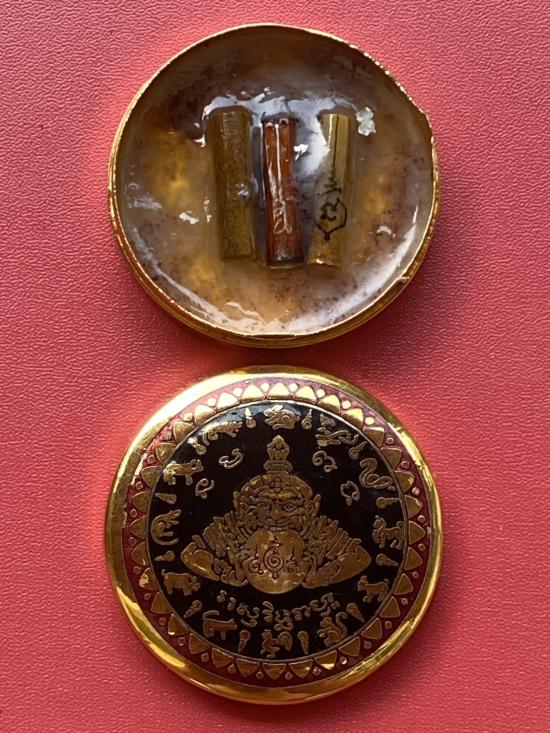 เคาะเดียวแดง สีผึ้งพระราหู รุ่น มงคลจักรวาล เนื้อ โลหะชุบทองลงยาสีดำขอบสีแดง ขนาด 5ซม |