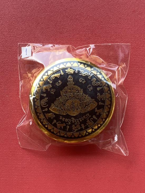เคาะเดียวแดง สีผึ้งพระราหู รุ่น มงคลจักรวาล เนื้อ โลหะชุบทองลงยาสีดำขอบสีดำ ขนาด 5ซม |