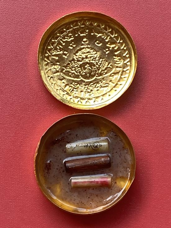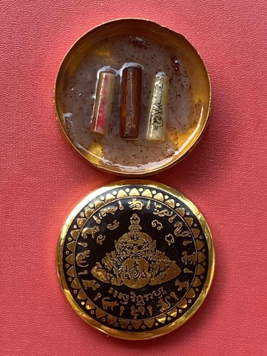 เคาะเดียวแดง สีผึ้งพระราหู รุ่น มงคลจักรวาล เนื้อ โลหะชุบทองลงยาสีดำขอบสีดำ ขนาด 5ซม |