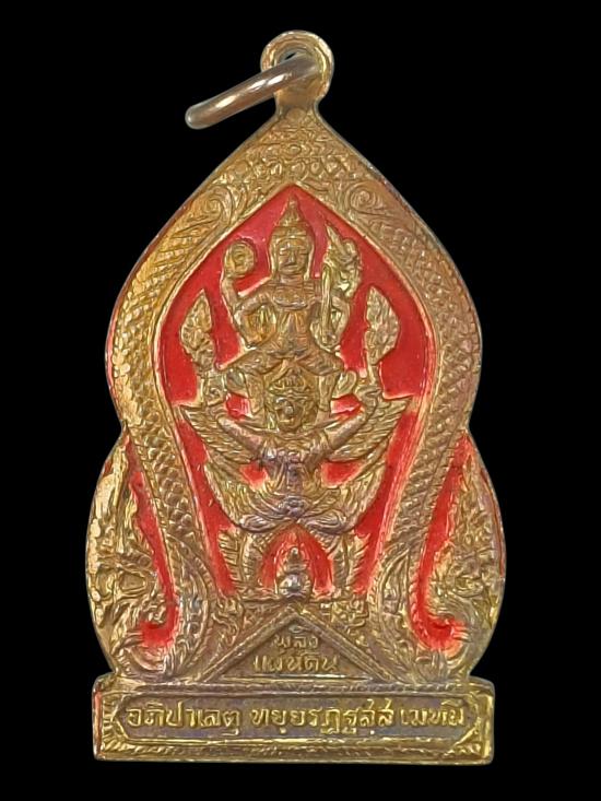 เหรียญกลมพระราชวังบวรมหาสุรสิงหนาท ด้านหลังนารายณ์ทรงครุฑพลังแผ่นดิน เนื้อกะไหล่ทองลงชาดแดง ปี 2519 หลวงปู่โต๊ะ วัดประดู่ฉิมพลี ปลุกเสก วัดใจ 100 แดงครับ |