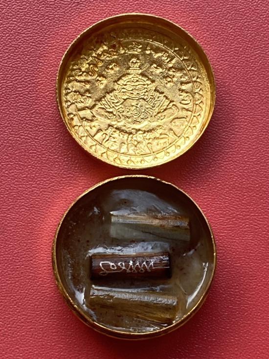 เคาะเดียวแดง สีผึ้งพระราหู รุ่น มงคลจักรวาล เนื้อ โลหะชุบทองลงยาสีดำขอบสีดำ ขนาด3.2ซม |
