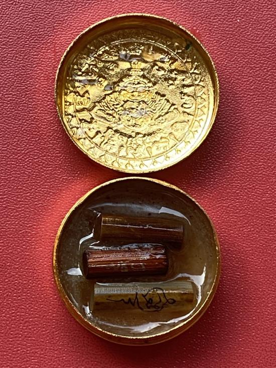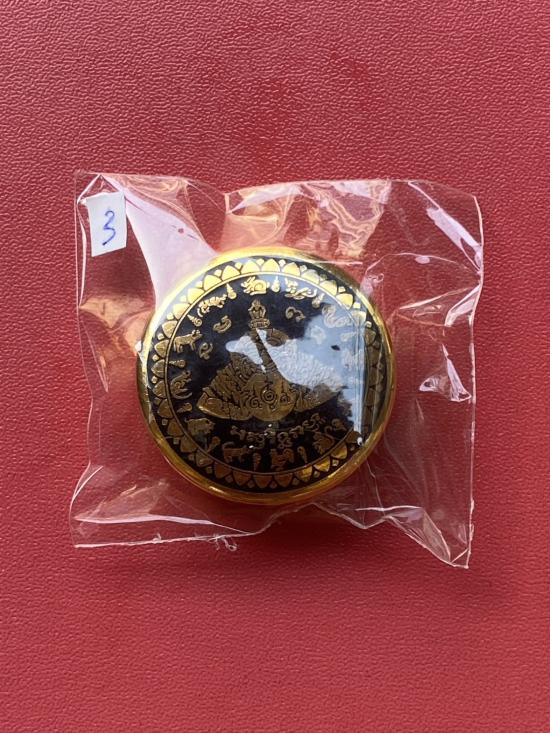 เคาะเดียวแดง สีผึ้งพระราหู รุ่น มงคลจักรวาล เนื้อ โลหะชุบทองลงยาสีดำขอบสีดำ ขนาด3.2ซม |