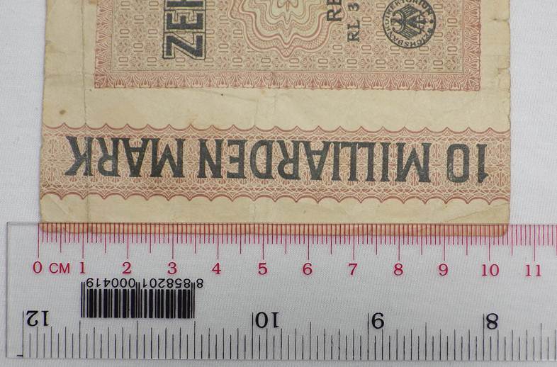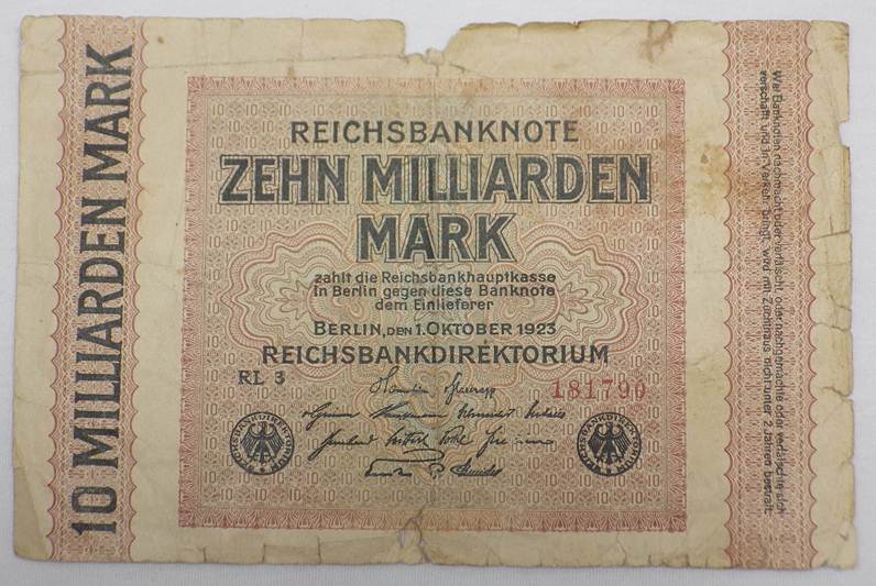 ธนบัตร10,000,000,000 Mark (10 พันล้านมาร์ก)ธนัตรเก่าของประเทศเยอรมนี ปีค.ศ. 1923 (พ.ศ. 2466) สภาพตามรูปครับ เคาะแรกแดง 100.-