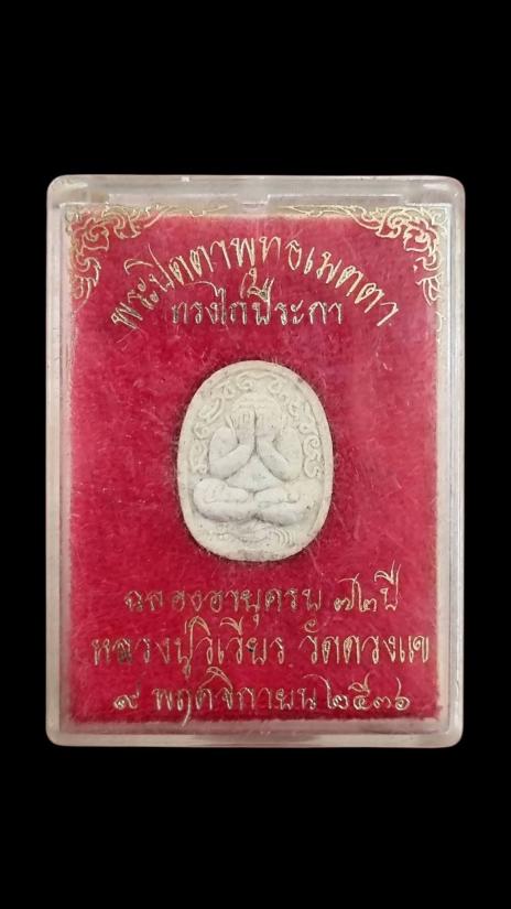 พระปิดตาพุทธเมตตา ทรงไก่ปีระกา เนื้อผงพุทธคุณ หลวงปู่วิเวียร วัดดวงแข ปี ๒๕๓๖ พร้อมกล่อง |