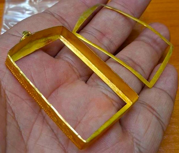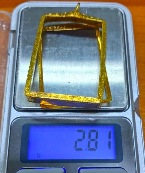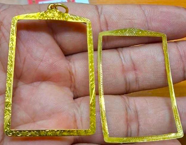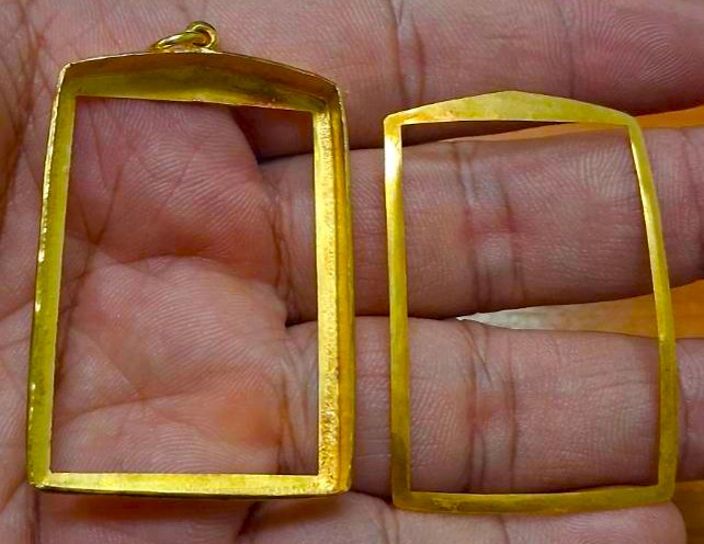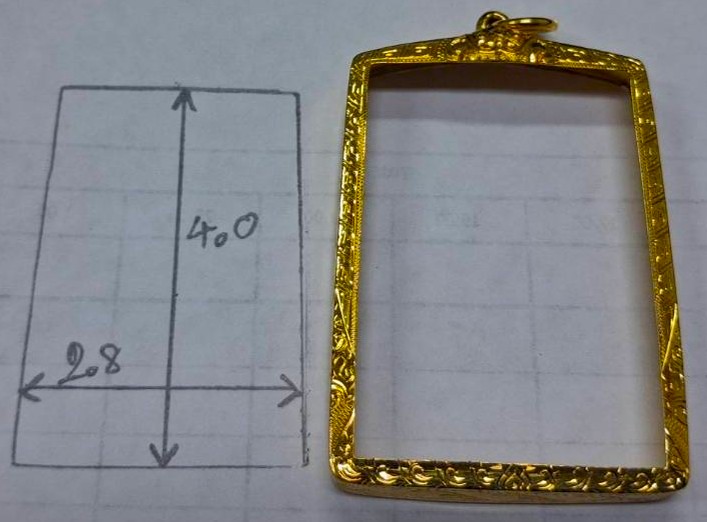 กรอบทองมือสอง ใส่พระสมเด็จยอดนิยน หรืออื่นๆทั่วไปที่ไกล้เคียง หน้าจอกว้าง 2.8 ซม., สูง 4.0 ซม. น้ำหนัก 2.81 กรัม เคาะเดียว
