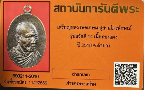 เหรียญหลวงพ่อเกษม สุสานไตรลักษณ์ รุ่นสวัสดี 14 เนื้อทองแดง ปี 2518 จ.ลำปาง (พร้อมบัตรรับรองฯ) |