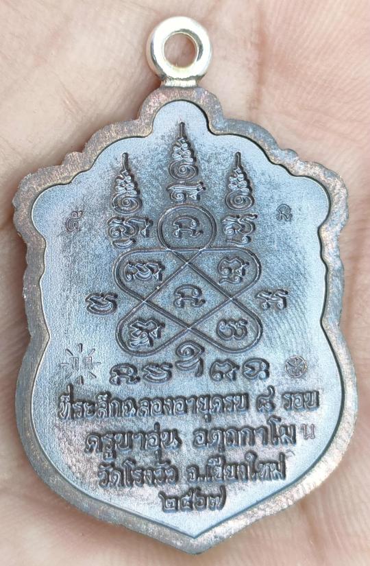 เหรียญเสมา๘รอบ ที่ระลึกวาระอายุครบ96ปี ครูบาอุ่น อัตถกาโม วัดโรงวัว จ.เชียงใหม่ (ศิษย์ครูบาศรีวิชัย) รก.ที่15 เนื้อนวะโลหะ ห่วงเชื่อมเงิน ฝังพลอยชมพู หลังยันต์ห้า ตอกโค๊ต"ยันต์นะ" หมายเลข 5 พร้อมกล่อง |