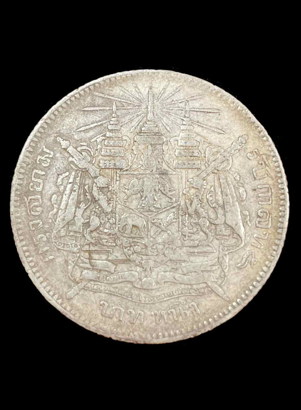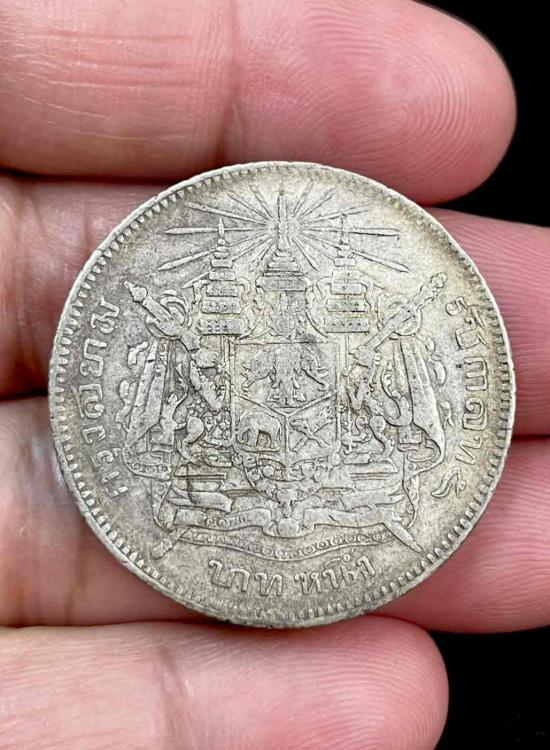 เหรียญเงิน บาทหนึ่ง รัชกาลที่ 5 หลังตราแผ่นดิน เนื้อเงิน น้ำหนัก 15 กรัม
