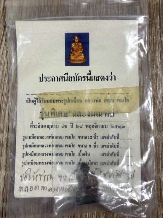 เปิดวัดใจ รูปหล่อหลวงพ่อเกษม เขมโก ขอให้ท่านจงเป็นผู้โชคดี เนื้อนวะโลหะโค้ดเลข+หนู พ.ศ. 2533 มาพร้อมซองเดิมประกาศนียบัตร |