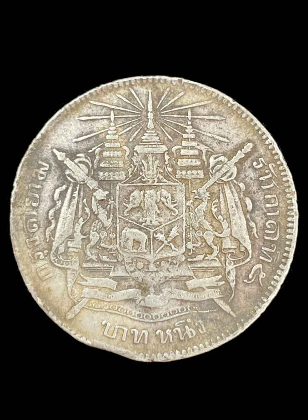 เหรียญเงิน บาทหนึ่ง รัชกาลที่ 5 หลังตราแผ่นดิน เนื้อเงิน น้ำหนัก 15 กรัม