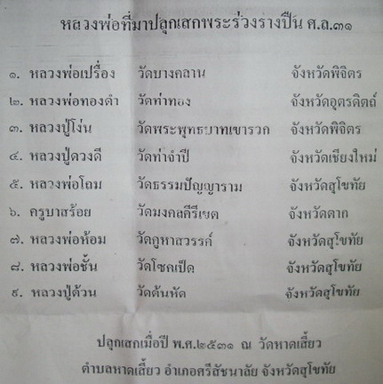 พระร่วงหลังรางปืน ศ.ล.31 เนื้อชินตะกั่ว วัดหาดเสี้ยว จ.สุโขทัย ปี2531 โดยทางอำเภอศรีสัชนาลัย จ.สุโขทัย ได้จัดสร้างขึ้น ปลุกเศกโดยเกจิอาจารย์ทรงคุณ ๙ องค์ร่วมปลุกเสกคือ