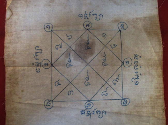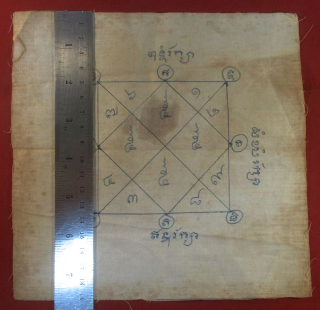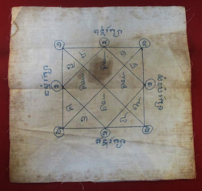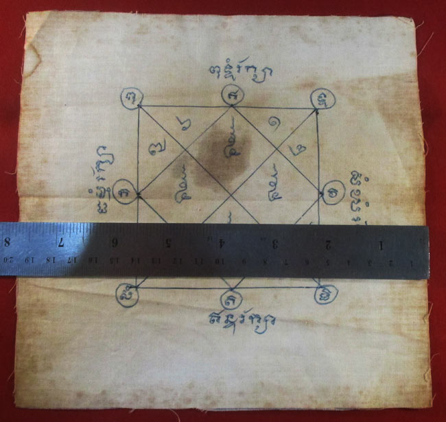 ผ้ายันต์ ไม่ทราบที่ จารยันต์ด้วยมือ เนื้อผ้าดูเก่า ครับ