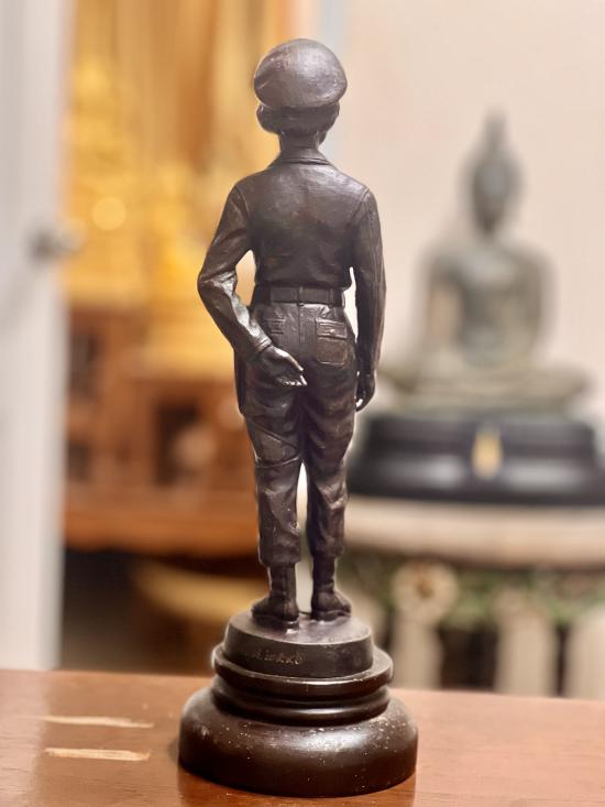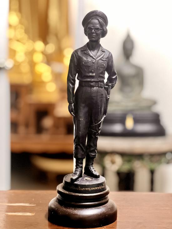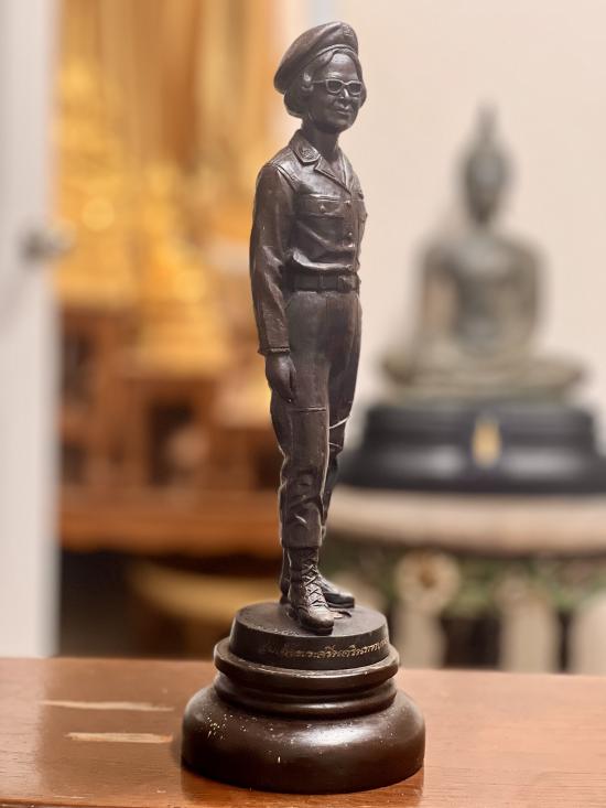 ทรงฉลองพระองค์ในชุดเครื่องแบบ ตชด. สูง 14 นิ้ว องค์สูง 11.5 นิ้ว ฐานไม้สูง 2.5 นิ้ว เนื้อโลหะรมมันปู จัดสร้าง