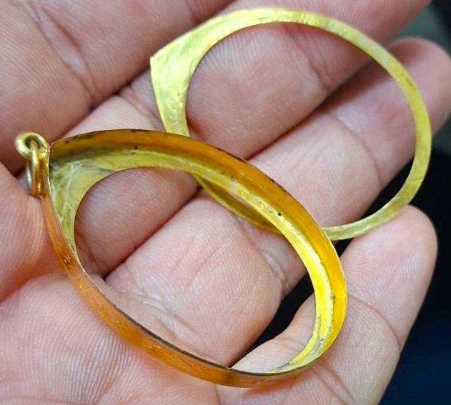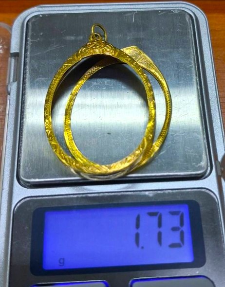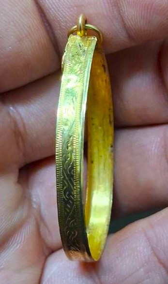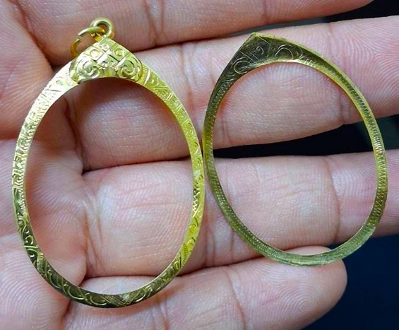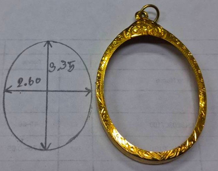 กรอบทองมือสอง ใส่เหรียญเจริญพรหลวงพ่อคูณ , เหรียญเจริญพร+นาคปรกหลวงปู่ทิม และเหรียญรูปไข่ทั่วไปที่ไกล้เคียง หน้าจอกว้าง 2.60 ซม., สูง 3.35 ซม. น้ำหนัก 1.73 กรัม เคาะเดียว