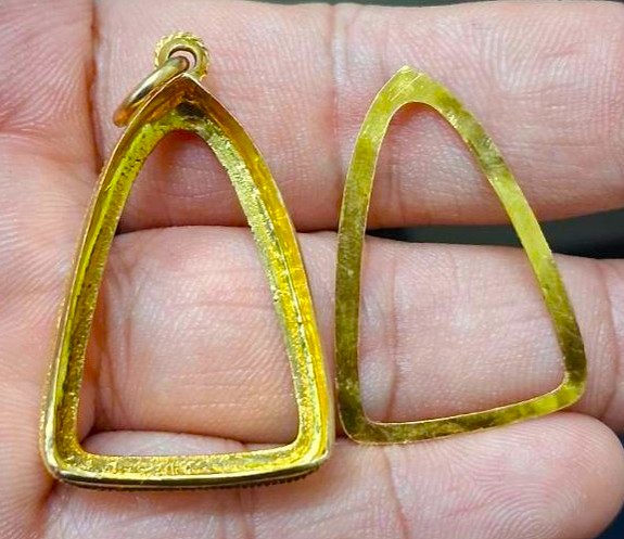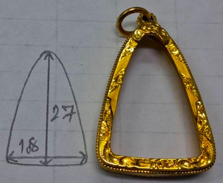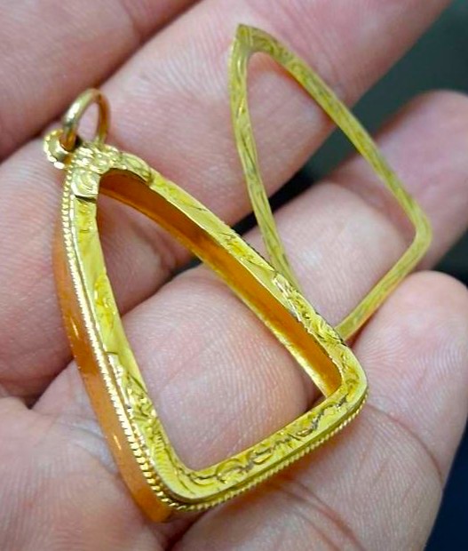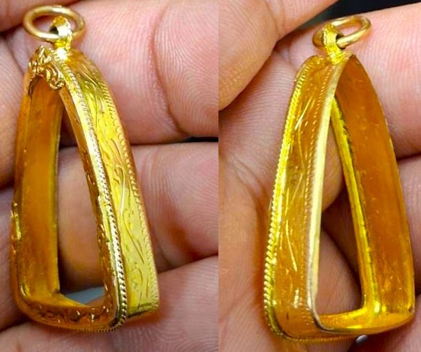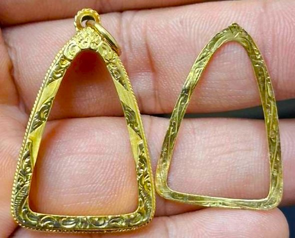 กรอบทองมือสอง ใส่พระกริ่ง พระชัย รูปหล่อ เนื้อดิน หรืออื่นๆทั่วไปที่ไกล้เคียง หน้าจอกว้าง 1.8 ซม., สูง 2.7 ซม. น้ำหนัก 3.75 กรัม เคาะเดียว