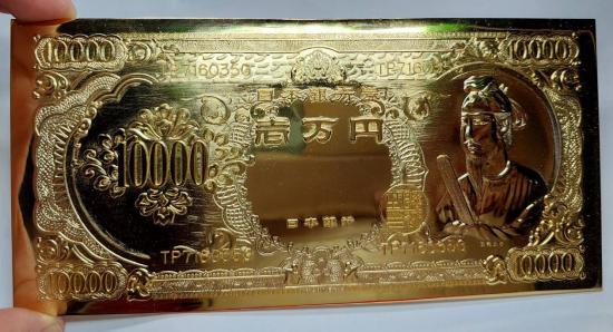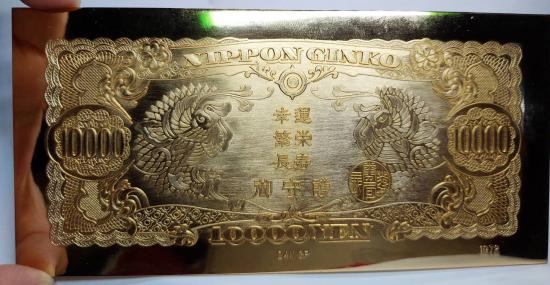 แผ่นธนบัตร เงินญี่ปุ่น ทองคำ งาน24k GP 10000 yen งานเก่า ปี 1972 ชุบทองคำ 99% |