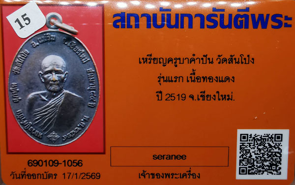 เหรียญครูบาคำปัน วัดสันโป่ง รุ่นแรก เนื้อทองแดง ห่วงเดิม ปี2519 จ.เชียงใหม่ + บัตรG-pra สภาพเดิมค่ะ |