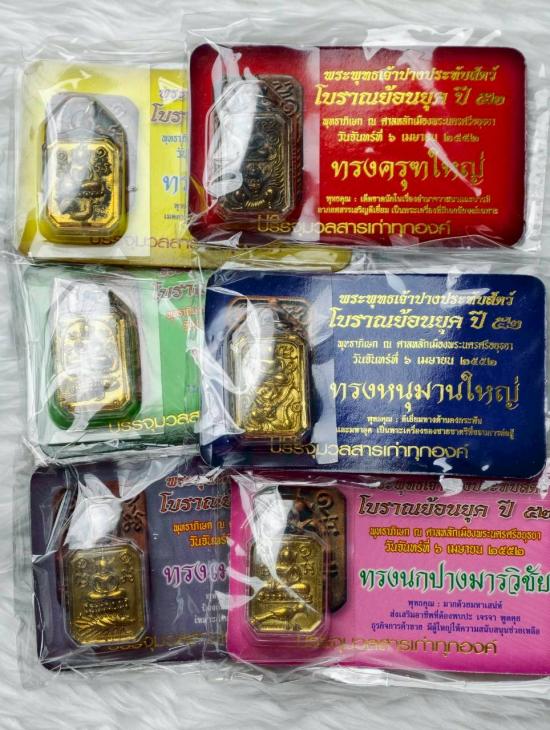 เคาะเดียวแดง พระพุทธเจ้าปางประทับสัตว์ เนื้อทองฝาบาตรโบราณ ย้อนยุค ชุด6องค์ 6พิมพ์ ปี 2552 รุ่นประวัติศาสตร์เทศบาลนครพระนครศรีอยุธยา พร้อมการ์ดยันต์เกราะเพชร |