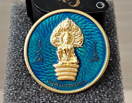 เหรียญจตุคามรามเทพ รุ่นดวงดี159 เนื้อชุบทองลงยาฟ้า No.๒๒ พร้อมกล่องเดิม ขนาดเหรียญ 2.8 cm. |