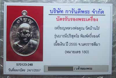 เหรียญหลวงพ่อคูณ รุ่นบารมีปริสุทโธ วัดดำเนินสถิตย์ (บ้านกอก) ปี55 เลข No.180 สวยพร้อมบัตรรับรอง