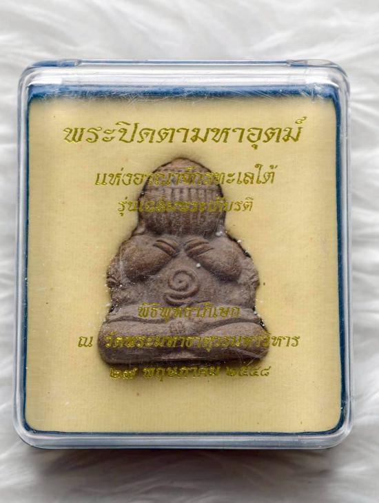 เริ่ม100 พระปิดตามหาอุตม์ แห่งอาณาจักรทะเลใต้ รุ่นเฉลิมพระเกียรติ ปี2548 จัดสร้างโดยวัดมหาธาตุวรมหาวิหาร เนื้อว่านมงคล ใต้ฐานบรรจุตะกรุดเงินคู่ ตอกโค้ด และยิงเลเซอร์หมายเลข 878 |