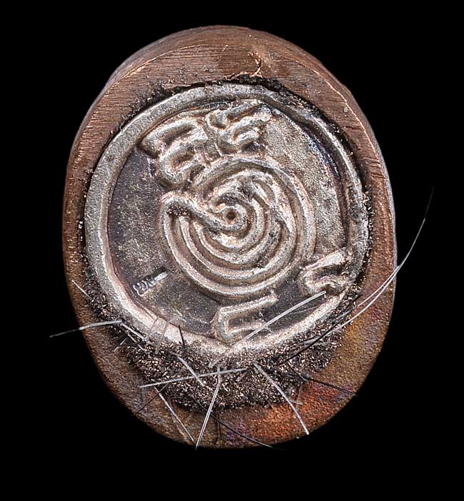 เสือมหาอำนาจ รุ่นแรก เนื้อนวะโลหะ ใต้ฐานเงิน มีจาร ยันต์ด้านหลัง แก้ม(ซ้าย-ขวา) เข่า (ซ้าย-ขวา) ตอกโค๊ตที่หัว และตอกโค๊ตที่ใต้ฐาน หมายเลข 34 อาจารย์ทอง วัดสำเภาเชย ปี 2547 จ.ปัตตานี |