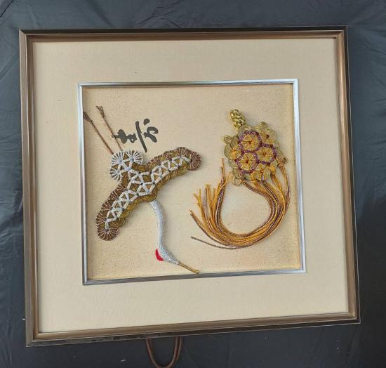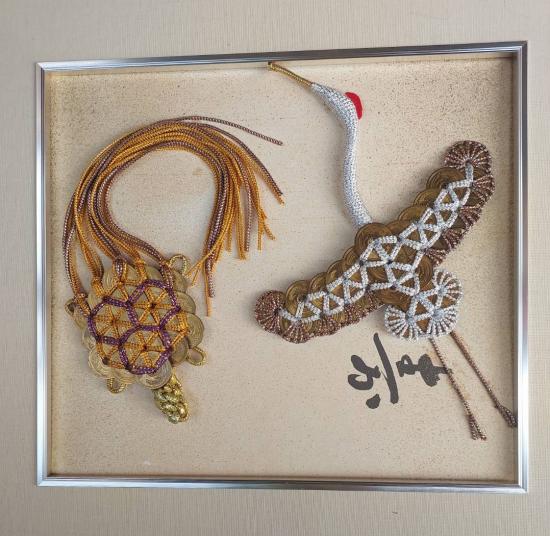 เหรียญ 5 เยน ทำเป็นเครื่องรางนำโชค งานฝีมือแบบญี่ปุ่นดั้งเดิม โดยมีนกกระเรียน (สึรุ) และเต่า (คาเมะ) ซึ่งเป็นสัญลักษณ์ของอายุยืนยาวและความโชคดี