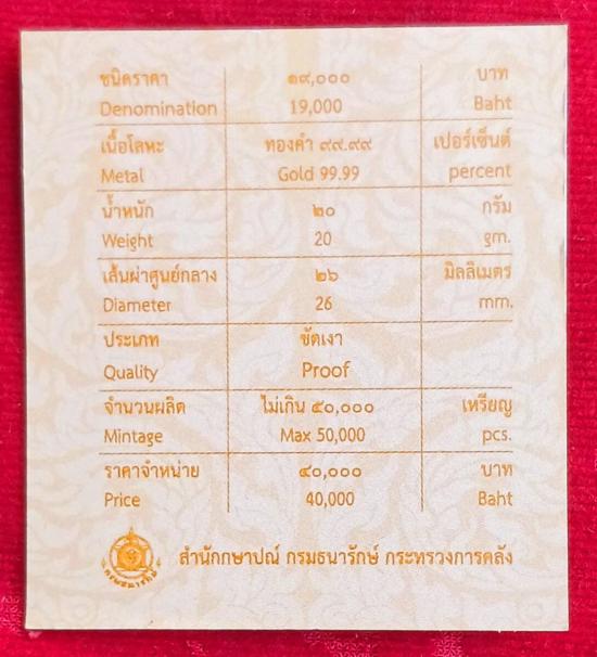 เหรียญที่ระลึกพระราชพิธีบรมราชาภิเษก รัชกาลที่ 10 ชนิดราคา 19,000 บาท เนื้อทองคำขัดเงา พ.ศ.2562 พร้อมกล่องและใบเซอร์ จัดทำโดยกรมธนารักษ์ ผลิตด้วยทองคำบริสุทธิ์ 99.99% หนัก 20 กรัม ขนาดเส้นผ่าศูนย์กลาง 26 มม. จำนวนการผลิตไม่เกิน 50,000 เหรียญ!